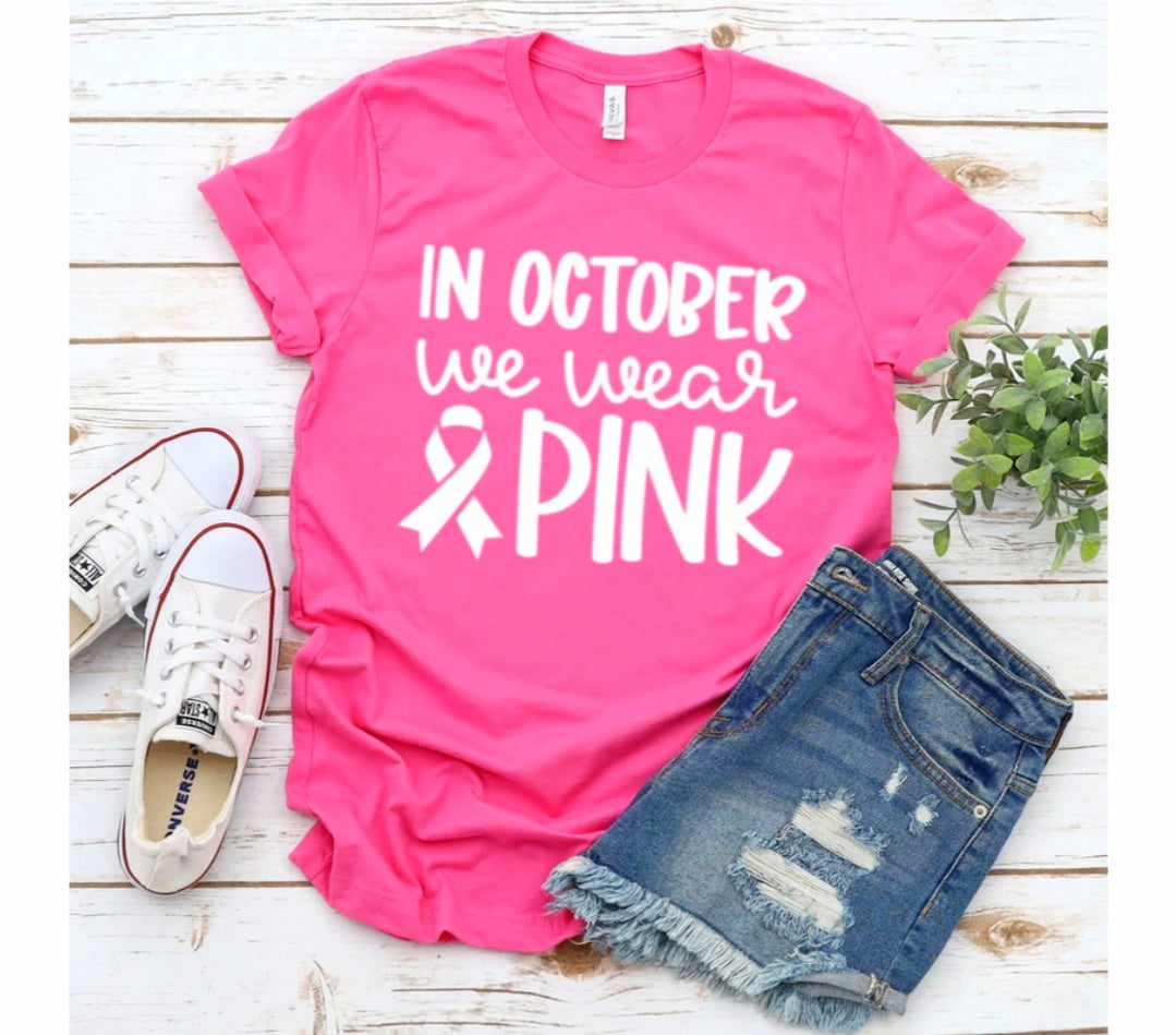 Support cancer awareness with this stylish and comfortable shirt. Featuring 'In October We Wear Pink in a white print', this shirt is perfect for displaying your commitment to the cause. Show your support and make a statement in October (or any time of year!) with this long-lasting, high-quality garment.
