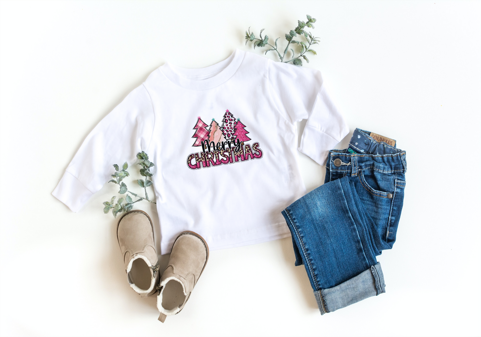 Celebrate the holiday season in style with this Merry Christmas kids' tee! This playful design features pink trees and a festive print, perfect for parties and family gatherings. Crafted from high-quality cotton for comfort and durability, this tee will keep your little ones looking merry and bright all year round.