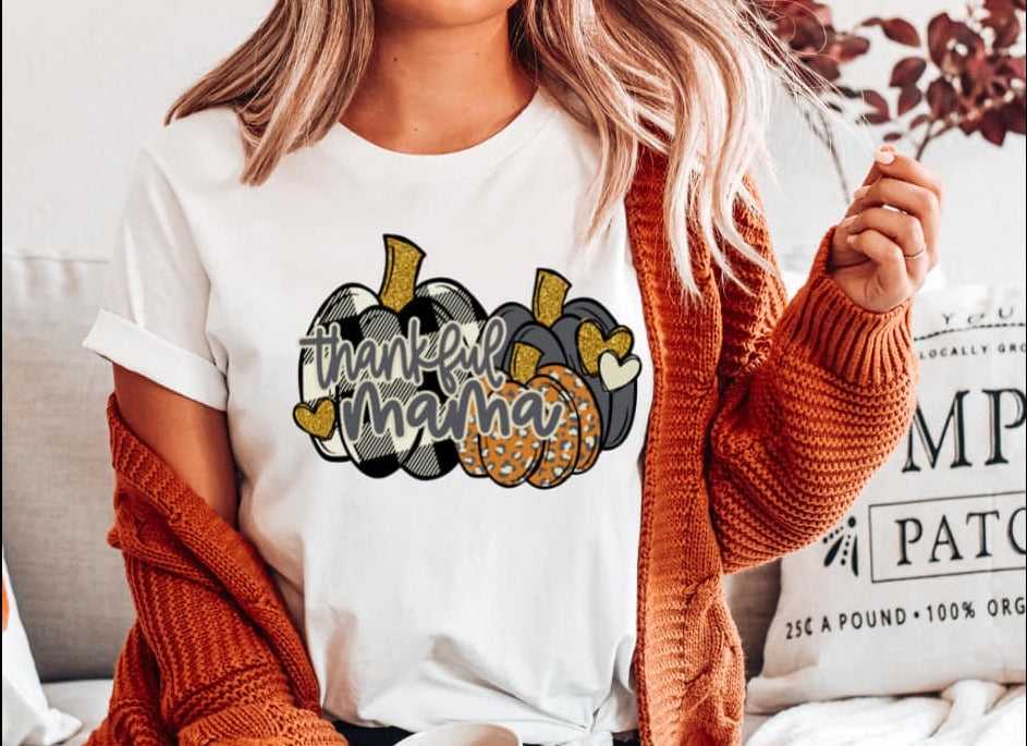 This stylish tee features a combination of a 'Thankful Mama' print, along with a classic pumpkin pattern. With its vibrant colour and patterning, you're sure to stand out in any crowd.